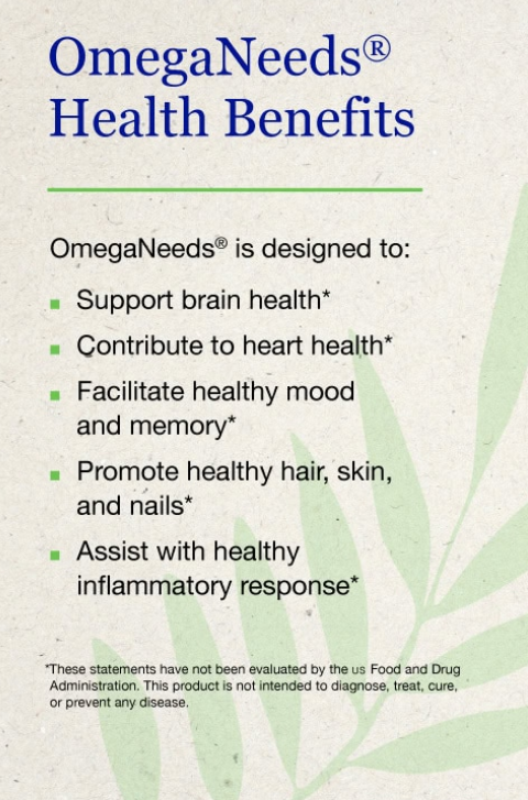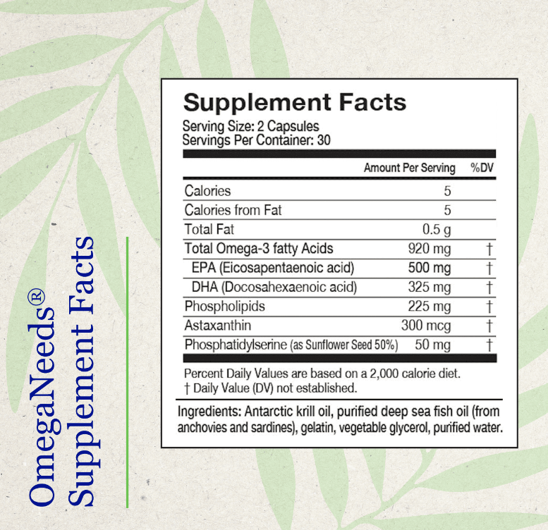 La mezcla única en OmegaNeeds™ aporta dosis altas de omega-3 junto con fosfolípidos, los cuales son esenciales para la promoción de la salud del cerebro, los ojos y el corazón. Los fosfolípidos no solo optimizan la absorción del omega-3, sino que también ofrecen soporte en la regeneración celular. Además, la sinergia entre los aceites de krill y los pescados azules maximiza sus beneficios antioxidantes, ayudando a proteger tus tejidos contra el estrés oxidativo.